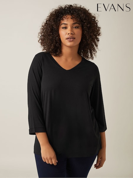 Evans Black 3/4 Sleeve V-Neck Modal T-Shirt
