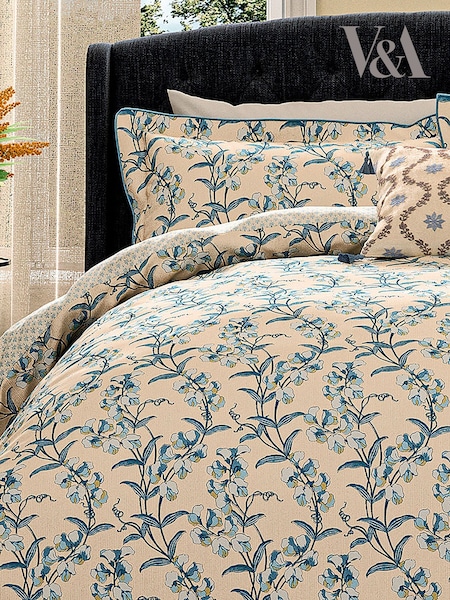V&A Indigo Ornamental Bloom 100% Cotton Duvet Cover and Pillowcase Set