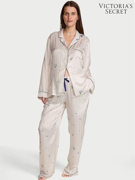Victoria's Secret White & Celestial Blue Ditsy Floral Satin Long Pyjamas Set
