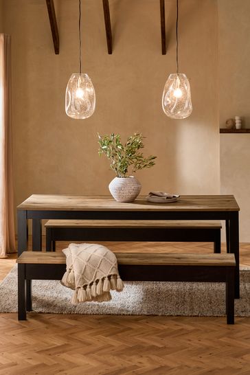 Part of the Bronx range, our rustic oak effect dining set comes with two benches. Dining Table: Height 75cm x Width 136cm x Depth 80cm. Bench: Height 46cm x Width 108cm x Depth 30cm.