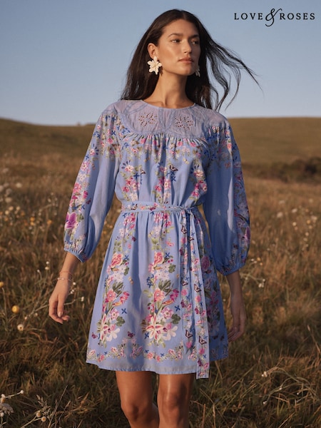 Love & Roses Pale Blue Floral Lace Trim Crew Neck Mini Dress