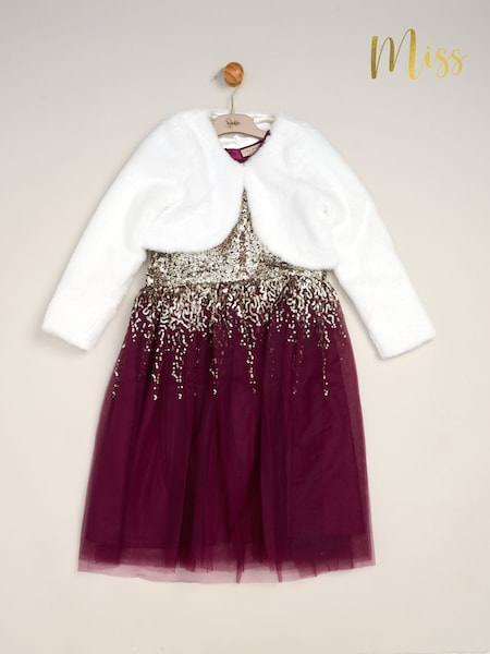Miss Dark Pink Waterfall Sequin Dress And Faux Fur Bolero Set