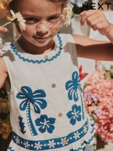 White/Blue Embroidery Embroidered Sleeveless Waistcoat (3-16yrs)