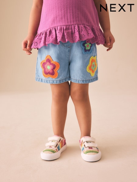 Mid Denim Crochet Flower Pull On Denim Shorts (3mths-10yrs)