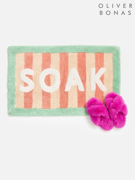Oliver Bonas Green Pink Bordered Striped Bath Mat