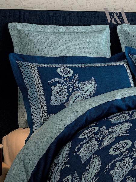 V&A Indigo Ornamental Bloom 100% Cotton Duvet Cover and Pillowcase Set