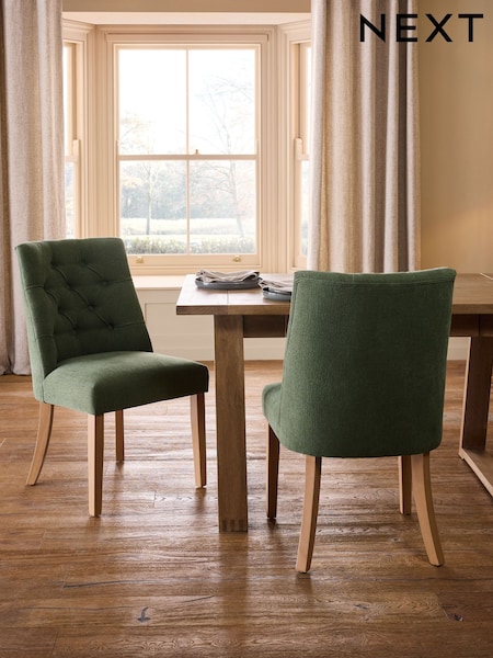 Set of 2 Relaxed Linen Look Forest Green Wolton Light Wood Leg Collection Luxe Button Dining Chairs