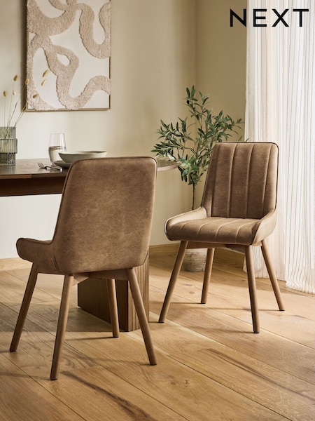 Set of 2 Distressed Faux Leather Tan Brown Atlas Mid Wood Leg Dining Chairs