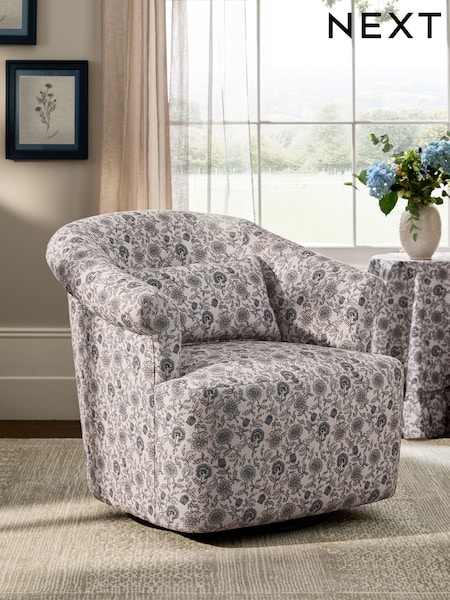 Relaxed Linen Look Woodblock Floral Print Blue Esme Swivel Accent Chair