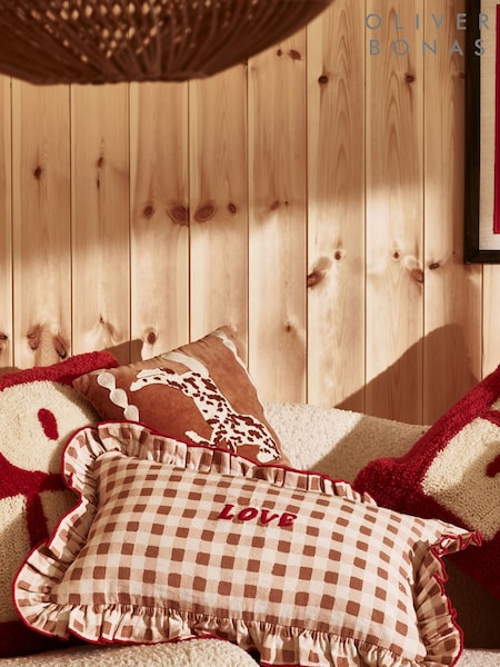 Oliver Bonas Brown Red Frill Love Gingham Cushion Cover