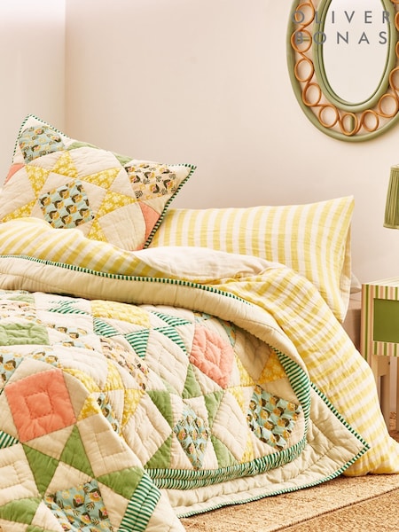 Oliver Bonas Green Cream Patchwork Diamond Pastel Multicolour Velvet Quilt