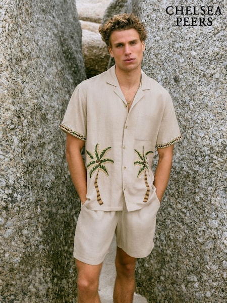 Chelsea Peers Natural Linen-Blend Embroidered Palm Short Sleeve Shirt