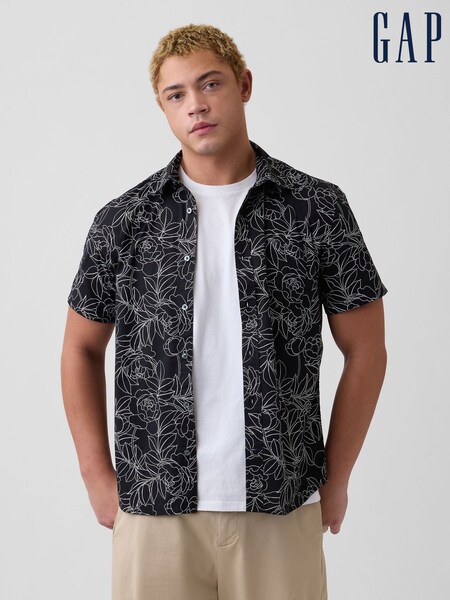 Gap Black Floral Linen-Cotton Relaxed Straight-Hem Shirt