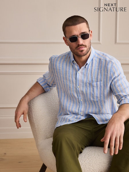 Blue Stripe Long Sleeve Signature 100% Linen Shirt
