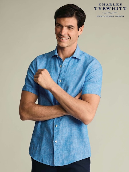 Charles Tyrwhitt Blue Plain Pure Linen Shorts Sleeve Shirt