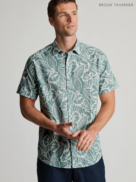 Brook Taverner Light Blue Botanical Print Slub Cotton Short Sleeve Shirt