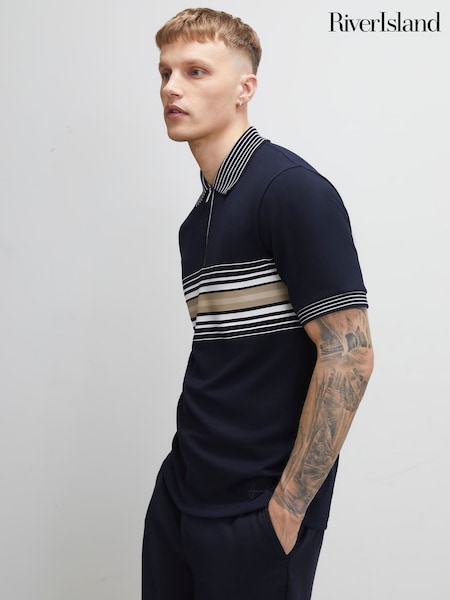 River Island Blue Slim Fit Stripe Panel Polo Shirt