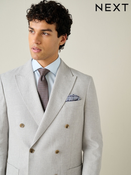 Light Grey Regular Fit Textured Linen Blend Double Breasted Blazer