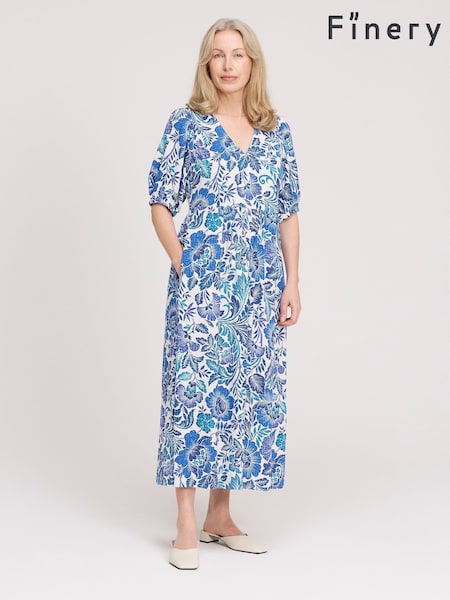 Finery Blue Addison Floral Print Button Through Linen Blend Midi Dress