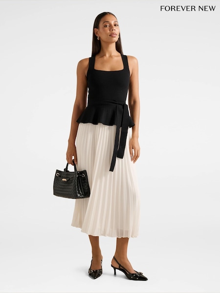 Forever New Black Peony Pleated Mixed Midi Dress Contains Linen