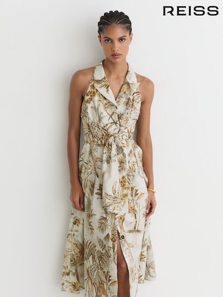 Reiss Ivory Tor Halterneck Belted Midi Dress with Linen