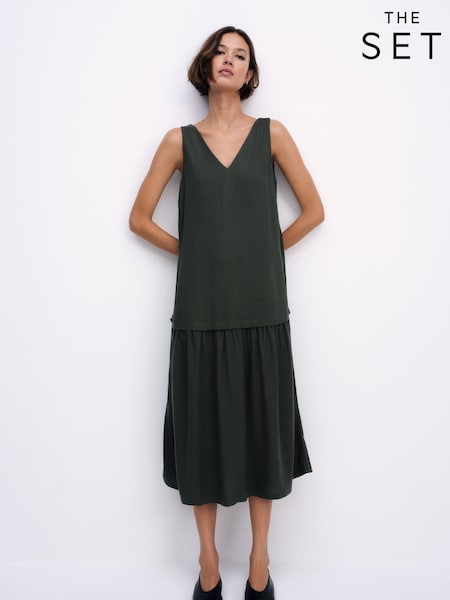 The Set 2 Pack Drop Waist Sleeveless V-Neck Midi Dresses With Linen Khaki Green/Chocolate Brown