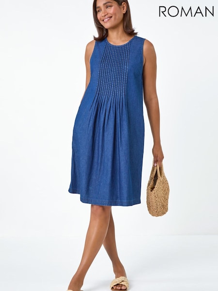 Roman Blue Denim Pintuck Detail Pocket Dress