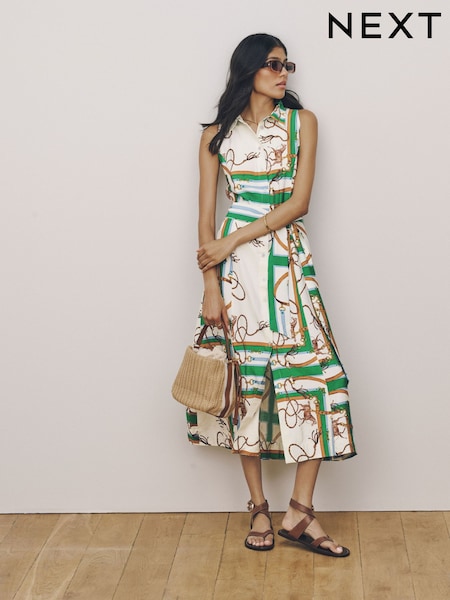 Green Print Halter Shirt Midi Belted Dress