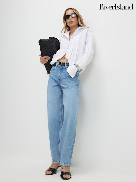 River Island White Mid Rise Drawcord Baggy Barrel Leg Jeans