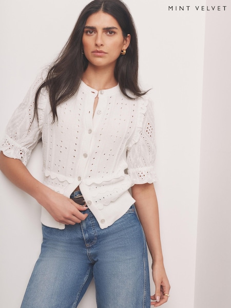 Mint Velvet White Cotton Broderie Knit Cardigan