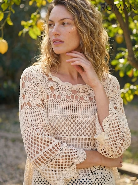 Roman Natural Crochet Knit Flared Sleeve Top