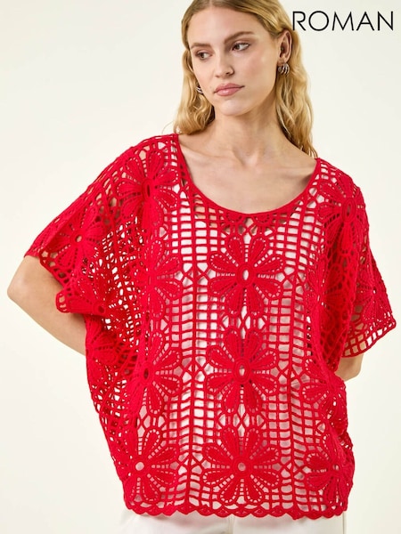 Roman Red Floral Crochet Knit Top