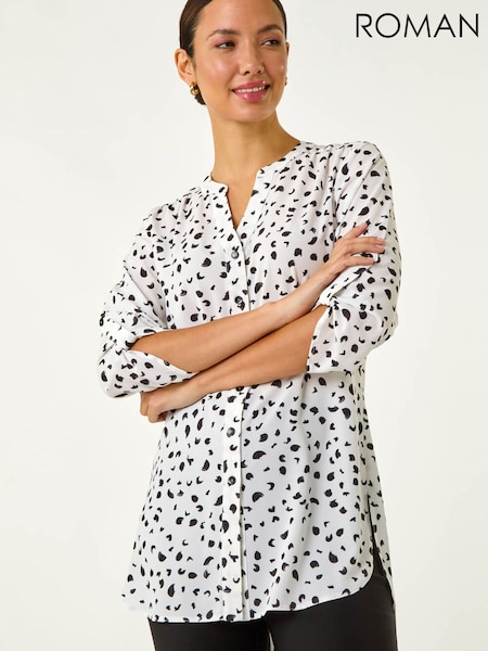 Roman White Spot Print V-Neck Button Blouse