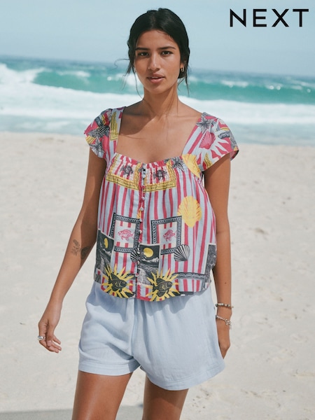 Pink/Blue Frame Print Flutter Sleeve Button Front Top With Linen