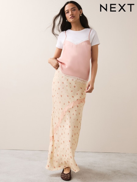 Cream/Pink Floral Satin Maxi Skirt With Lace