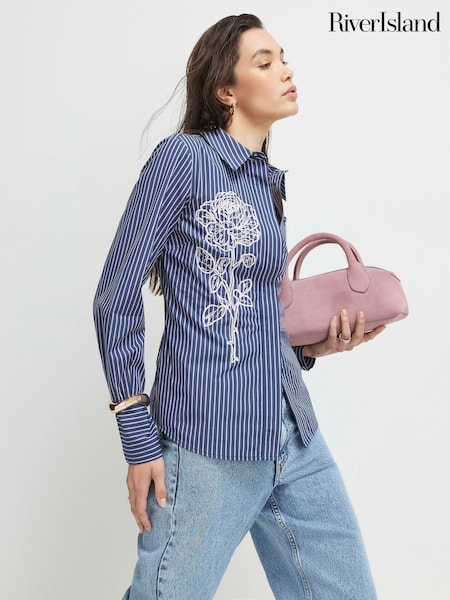 River Island Blue Embroidered Motif Long Sleeve Shirt