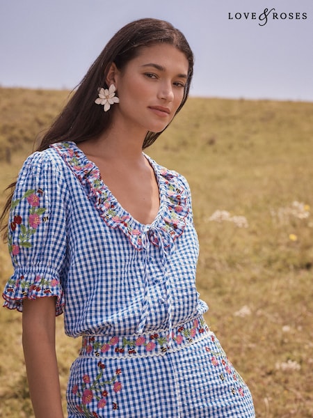 Love & Roses Blue Petite Gingham Embroidered Blouse