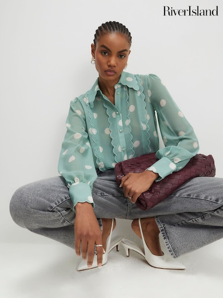 River Island Blue Long Sleeve Scallop Hem Polka Dot Shirt