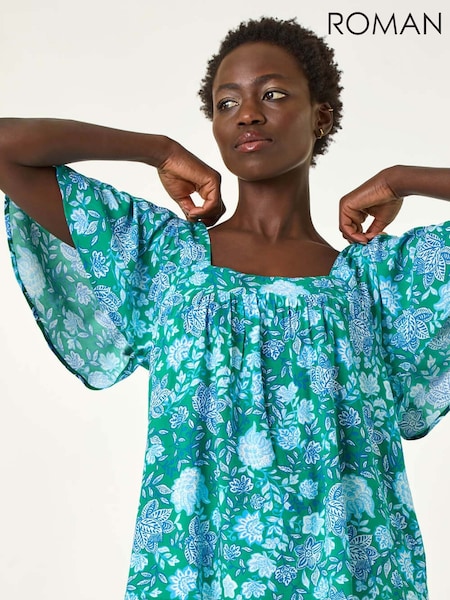 Roman Green Floral Print Square Neck Top