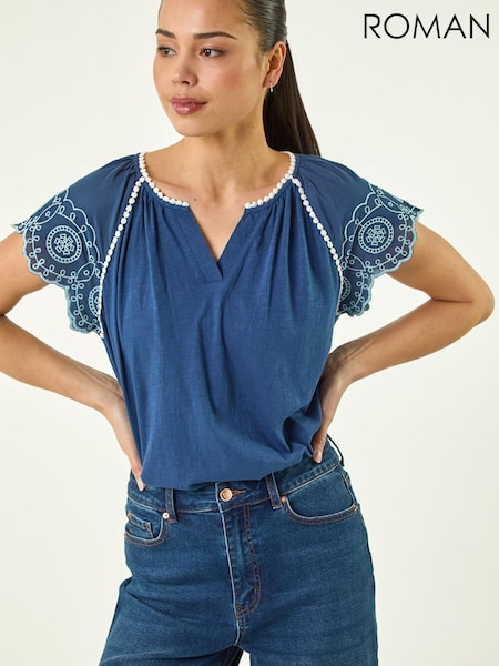 Roman Blue Petite Embroidered V-Neck Top
