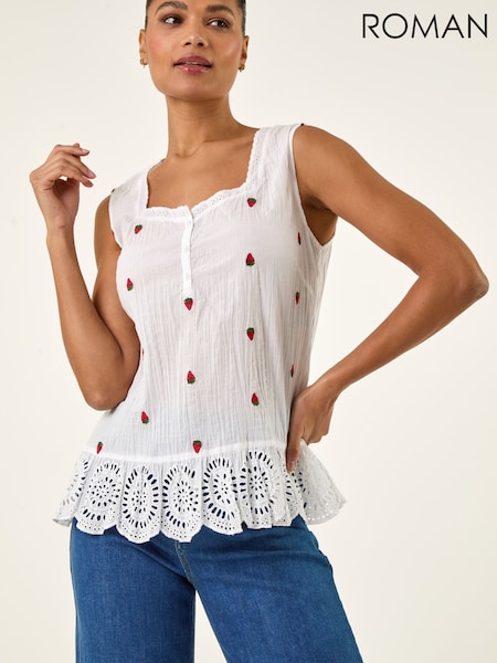 Roman White Strawberry Embroidered Crinkle Vest Top