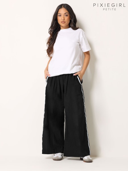PixieGirl Petite Black Linen Blend Side Stripe Wide Leg Trousers