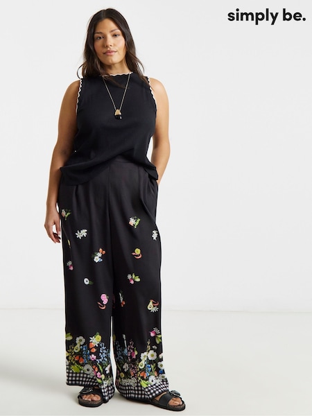 Simply Be Black Floral Fruit And Veg Print Wide Leg Trousers