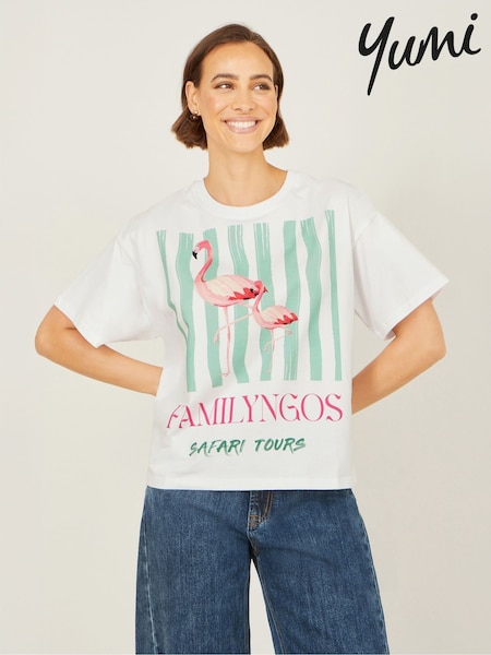 Yumi White Retro Relaxed Flamingo Cotton T-Shirt