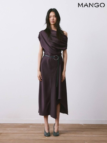 Mango Brown Asymmetric Drape Satin Maxi Dress