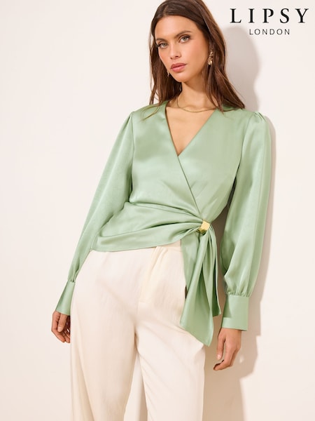 Lipsy Green Satin Hardware Detail Wrap Top
