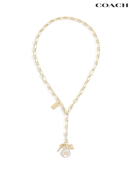COACH Gold Tone Signature Mother of Pearl Coin Charm Y Necklace