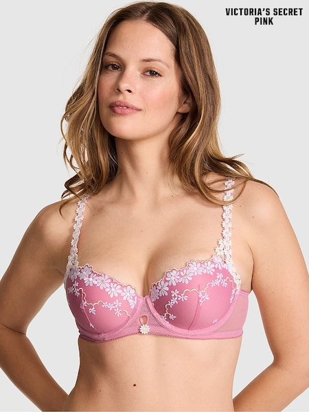 Victoria's Secret Pink Cashmere Rose Pink Lightly Lined Balcony Daisy Embroidery Bra