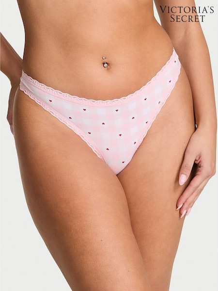 Victoria's Secret Pretty Blossom Pink Gingham Heart Thong Cotton Lace Trim Knickers