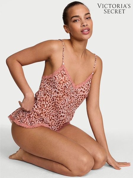 Victoria's Secret Leopard Brown Satin Rose Lace Trim Cami & Flutter Shorts Set